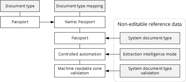 Document types are mapped to system document types in the reference data Document type mapping, which defines the extraction mode for the document type. The reference data Document type mapping also defines the document linking mode and the extraction validation, such as machine readable zone validation.