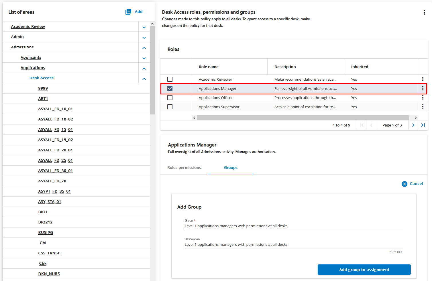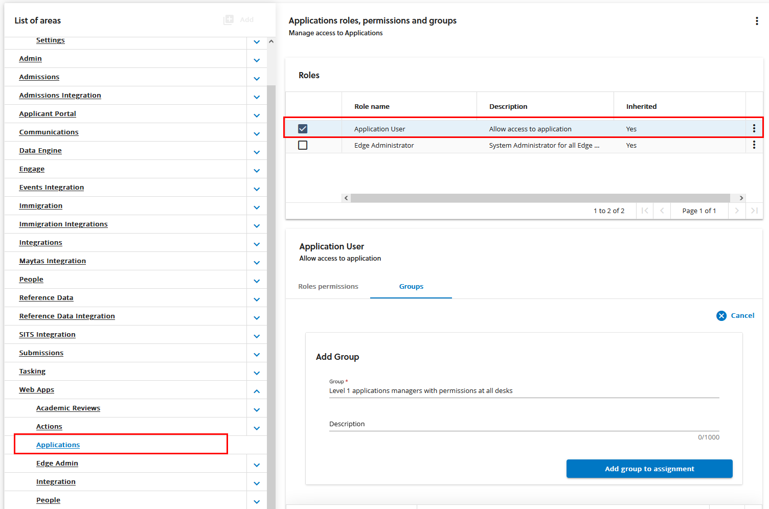 Assign groups to roles in authorisation areas. For example, assign groups to roles in the Web apps area to use apps, such as Applications, and to roles for features, such as the Applications supervisor role. The role then defines the permissions of the users in the group.
