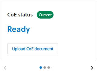 Admissions officers view and update the CoE status of an application in the applicant overview. The image CoE status shows the CoE status on the Identity & Immigration tab of an application for the current CoE, which has the status Ready. The application has three CoEs associated with it, as represented by the three dots (eact represents a CAS request associated with the application).
