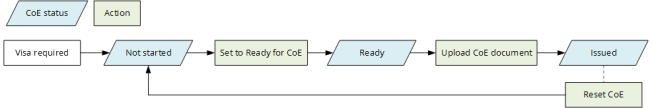 If needed, admissions officers can reset the CoE status. For example, the applicant's visa application was rejected and a new CoE is to be issued. Resetting the CoE status sets the status to Not started.